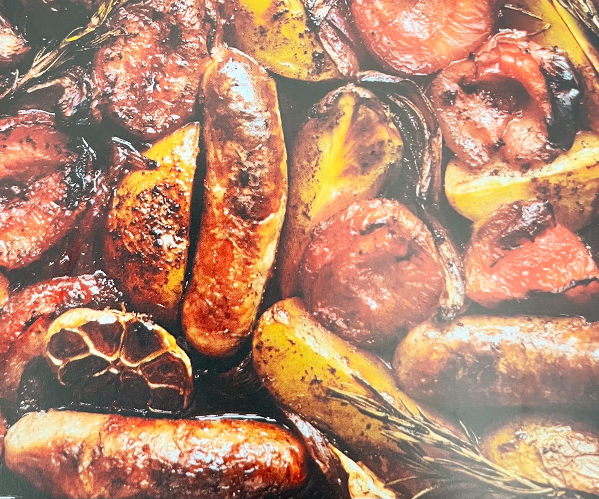 Pour this all over the contents of the pan, then return it to the oven for 40 minutes, turning the sausages once halfway through, so they cook and color evenly.